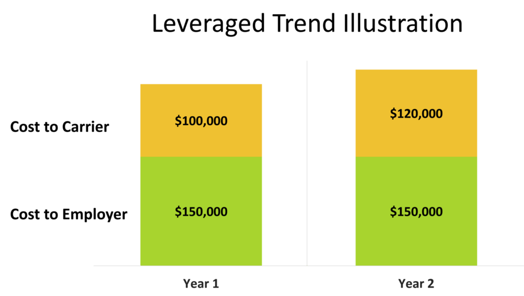 When medical costs are rising, there is a disproportionate effect on the risk transferred to the Stop Loss carrier than the risk kept by the employer, all other things being equal. This effect is called “leveraged trend.” This concept can be hard to grasp, so let’s unpack it:
